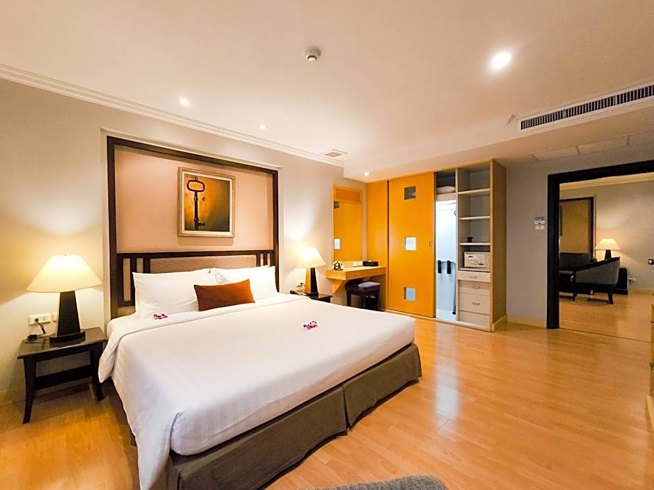 Spacious suite features a separate living room with sofa, 2 armchairs and 2 TVs.